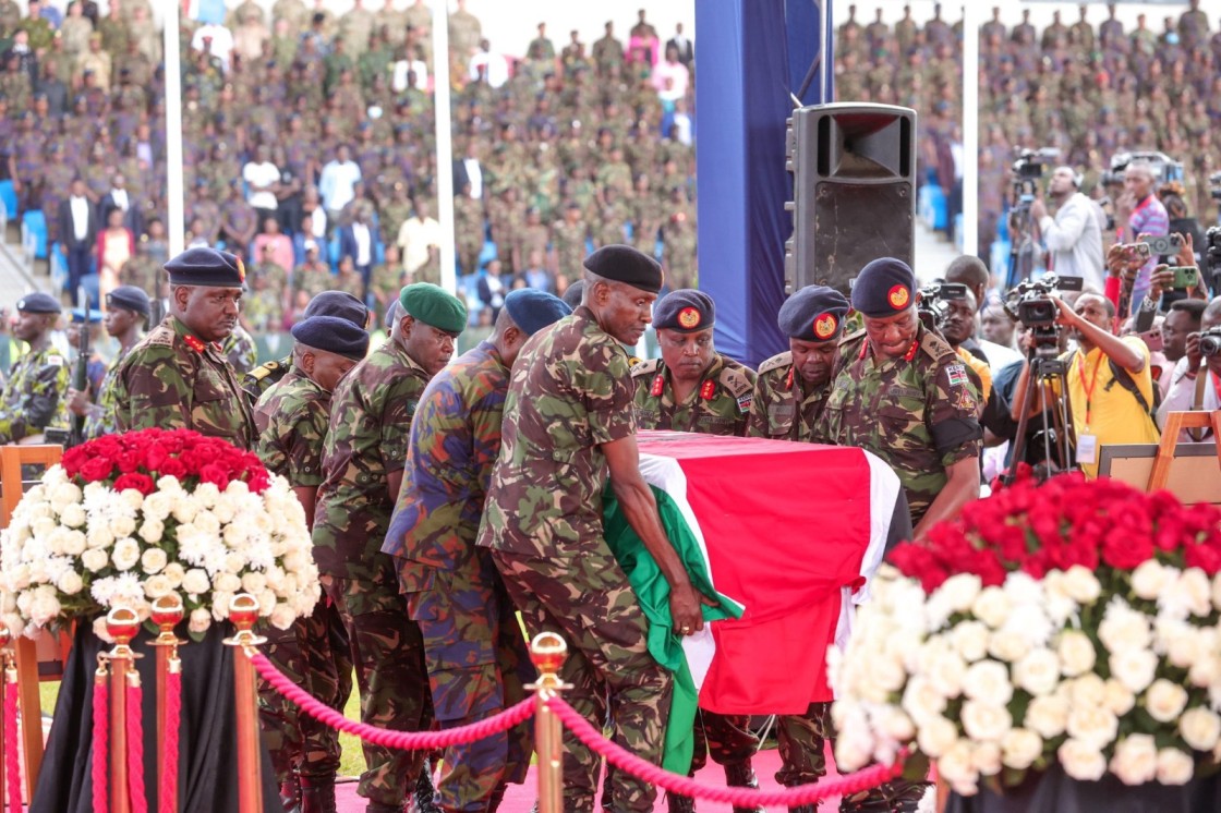 Pallbearers carrying the casket of the late General Francis Omondi Ogolla, Kenya’s Chief of Defence Forces. PHOTO/KDFMemorial service
