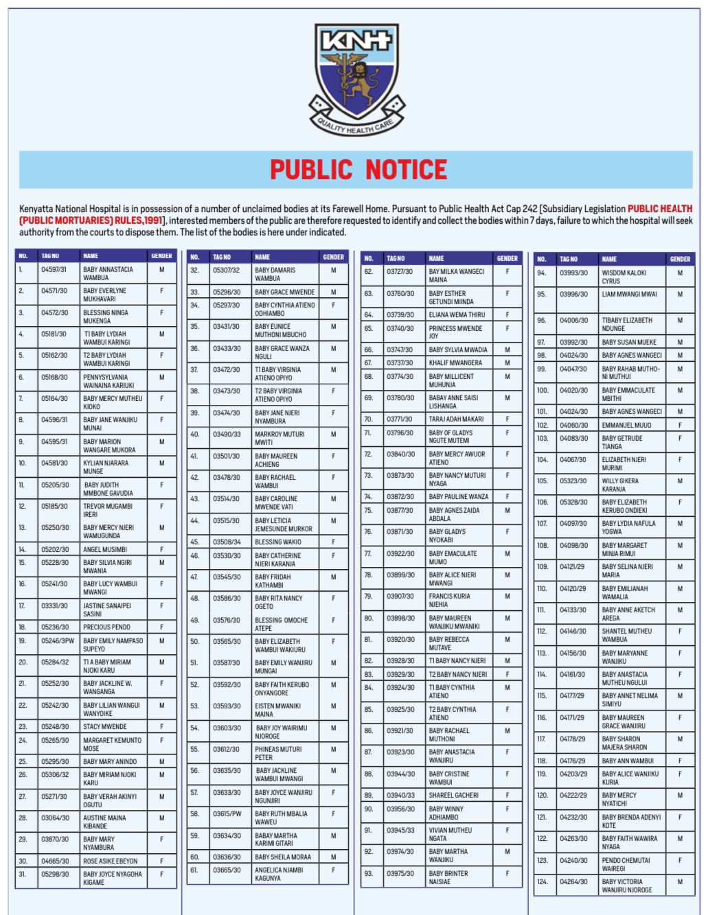 Kenyatta National Hospital has issued a public notice announcing plans to dispose of 124 unclaimed bodies currently lying at its Farewell Home, if they are not identified and collected within seven days.
