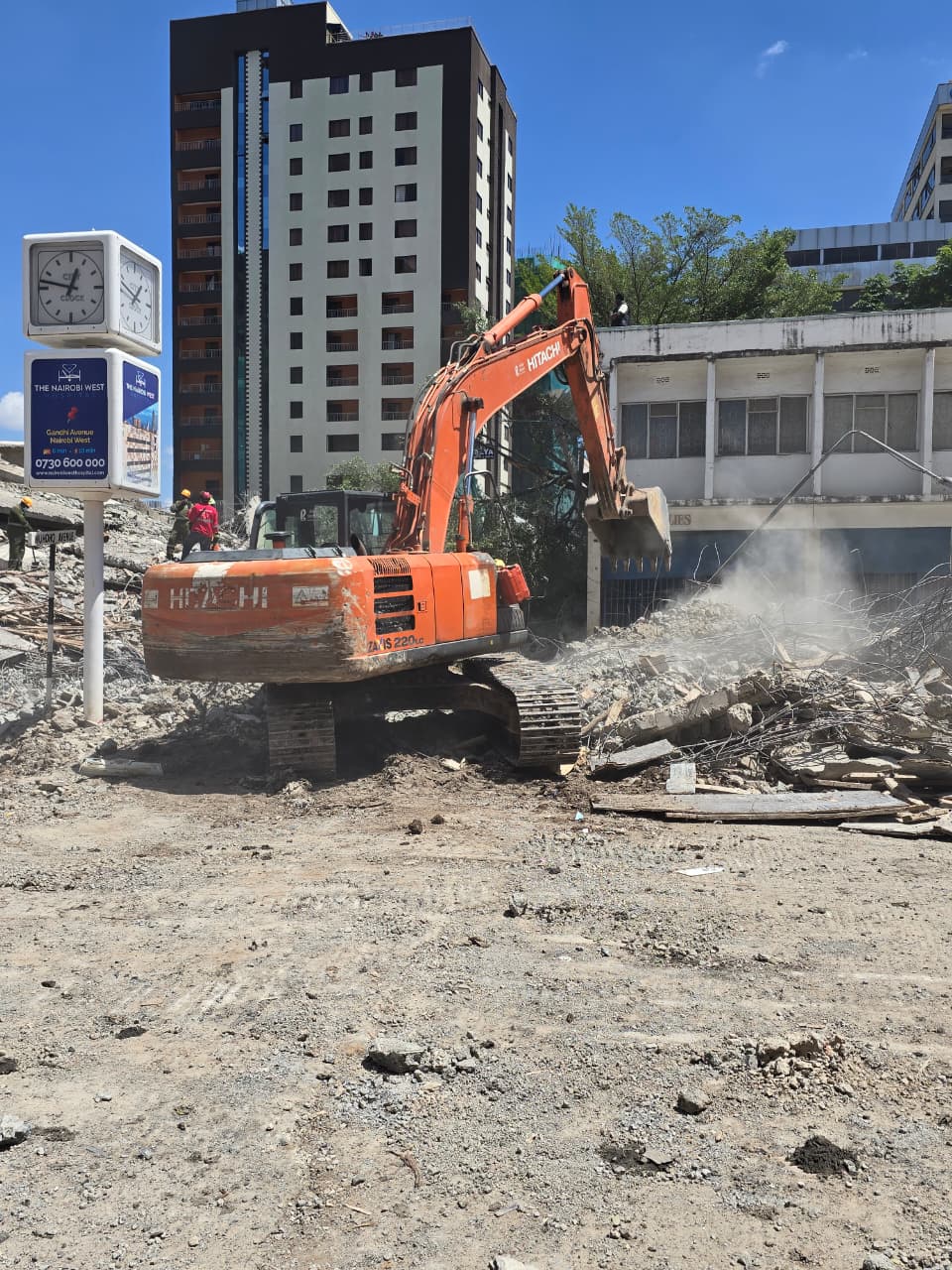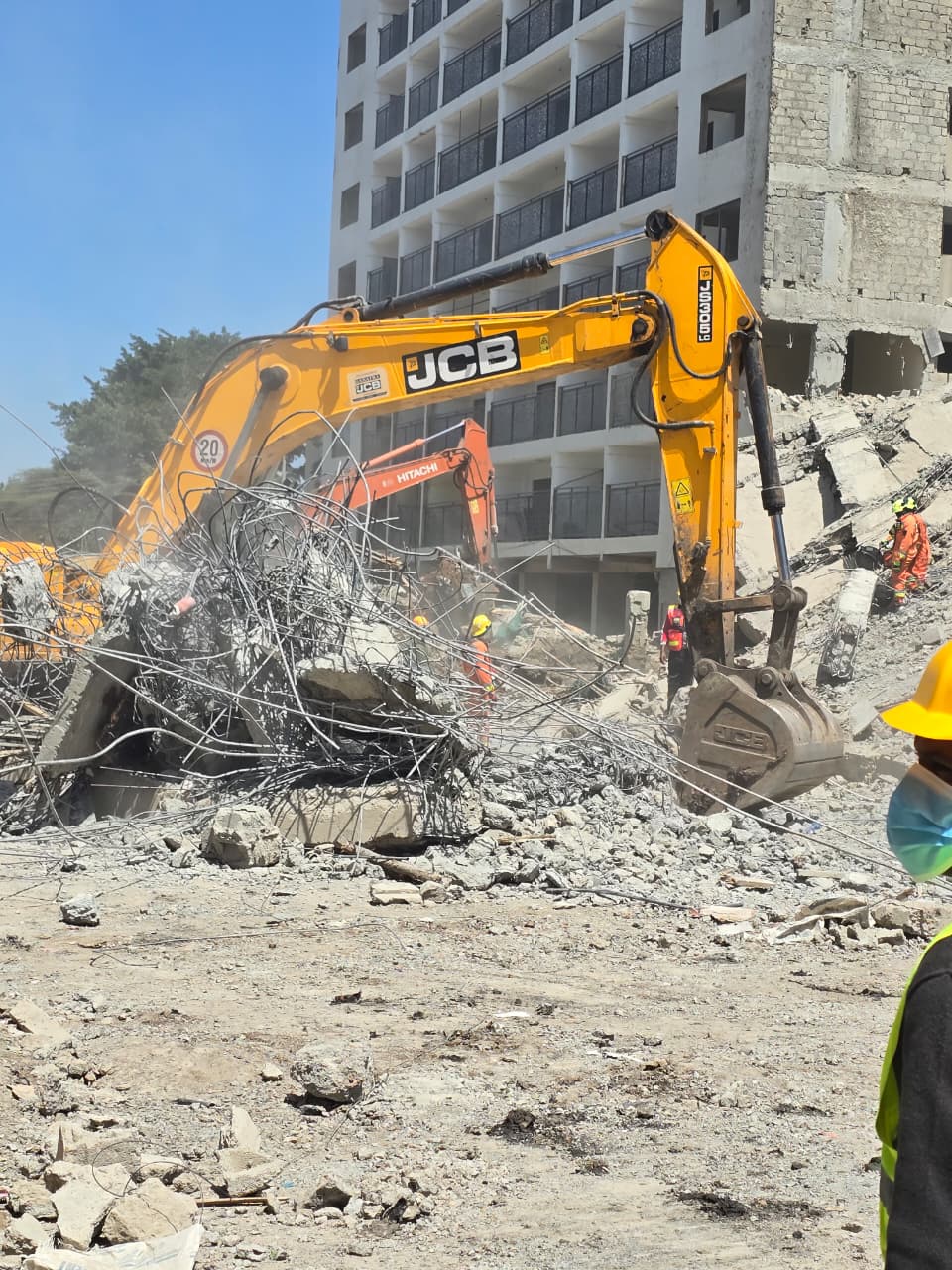 An excavator clears rubble at the scene of a collapsed building in South C, Nairobi, on January 2, 2026, as rescue teams look on. PHOTO/RG