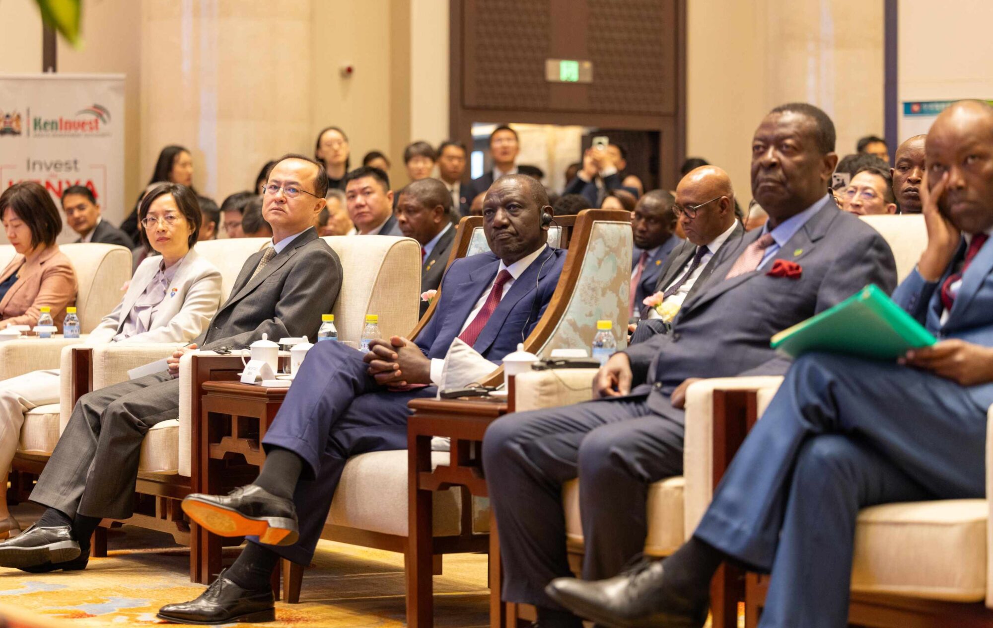 President William Ruto (cross-legged) and other government officials following proceedings during the Kenya-China business forum in China. PHOTO/PCS