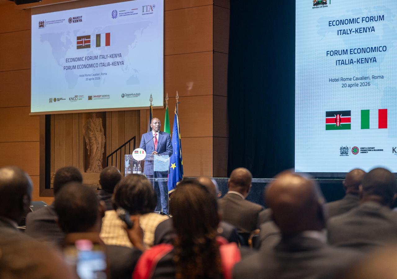 President William Ruto speaking on Monday, April 20, 2026 during the Italy–Kenya Business Forum in Rome, Italy. PHOTO/PCS