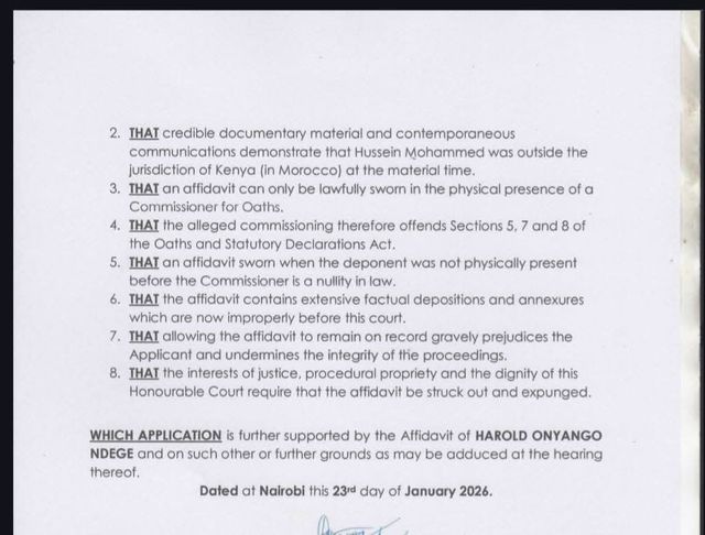 In a dramatic escalation, Ndege has asked the court to compel Mohammed to produce his original passport and immigration movement records for January, seeking to prove the president’s whereabouts at the time the affidavit was executed.