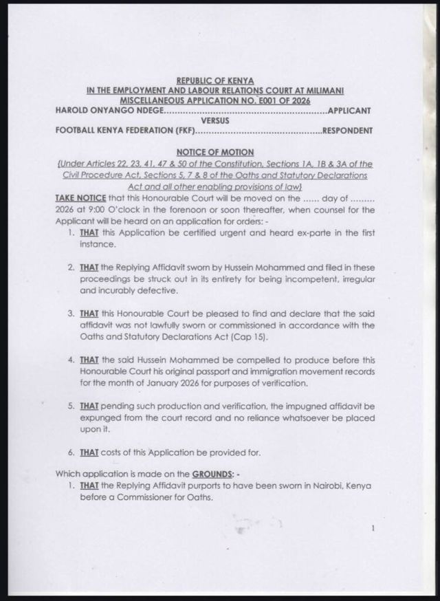 The tug-of-war at the Football Kenya Federation has intensified into a courtroom drama. Harold Ndege, the federation’s embattled chief executive, has launched a legal assault on an affidavit sworn by Hussein Mohammed, asking the court to declare the document void as part of his challenge to moves to remove him from office.